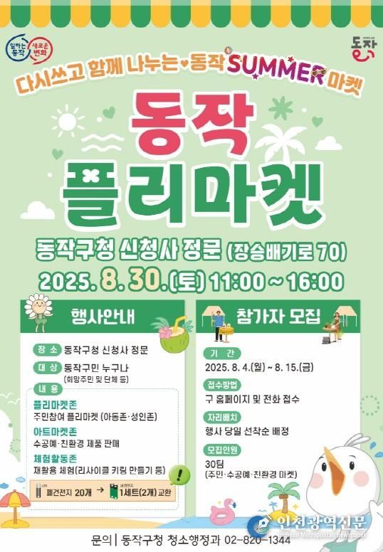 [인천광역신문] 최훈 기자 | 동작구가 오는 30일 오전 11시부터 오후 4시까지 구청 신청사 정문 일대에서 ‘동작 플리마켓’을 개최한다고 밝혔다.
