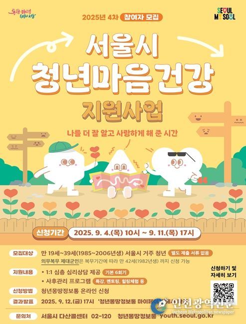 [인천광역신문] 최훈 기자 | 청년의 마음 건강 회복을 돕고 성장을 위한 마음 역량을 길러주는 ‘서울 청년 마음건강 지원사업’이 올해 마지막 4차 참여자를 모집한다.