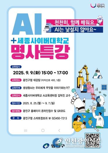 [인천광역신문] 최훈 기자 | 광진구는 오는 9월 9일 오후 3시, 광진구청 대강당에서 ‘인공지능(AI) 명사 특강’을 개최한다.