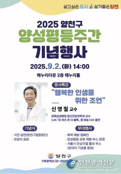 [인천광역신문] 최훈 기자 | 양천구는 양성평등주간(9.1.~9.7.)을 맞아 오는 9월 2일 오후 2시 해누리타운 2층 해누리홀에서 ‘2025 양성평등주간 기념행사’를 개최한다고 28일 밝혔다.
