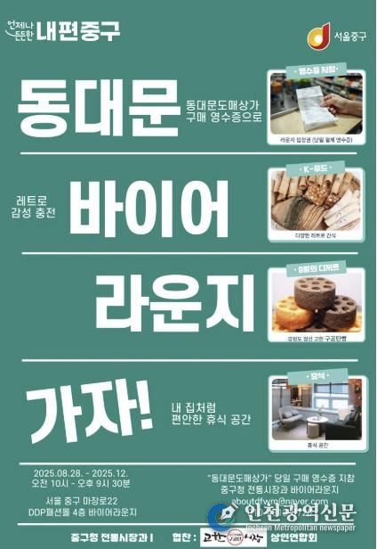 [인천광역신문] 최훈 기자 | 서울 중구가 오늘(28일)부터 ‘동대문 바이어라운지’를 K-푸드, K-패션, K-문화 체험이 가능한 공간으로 새롭게 단장하고, 바이어와 관광객, 그리고 전국 전통시장이 교류하는 상생 플랫폼으로 운영한다.