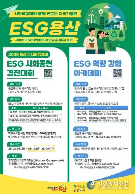 [인천광역신문] 최훈 기자 | 서울 용산구가 내달 12일까지 ‘2025 용산구 ESG 사회공헌 경진대회’에 참가할 지역 내 사회적경제기업을 모집한다.