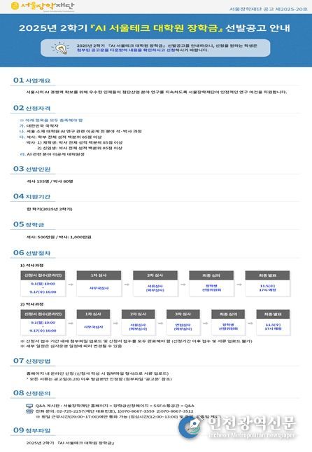 [인천광역신문] 최훈 기자 | 서울장학재단이 미래 AI 산업의 주역이 될 인재 육성을 위해 ‘AI 서울테크 대학원 장학금’ 지원 대상을 박사 과정까지로 확대하고, 오는 9월 1일부터 2학기 장학생을 모집한다.