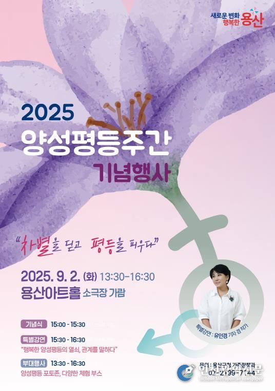 [인천광역신문] 최훈 기자 | 서울 용산구가 양성평등주간(9월 1일~7일)을 맞아 9월 2일 용산아트홀 소극장에서 기념행사를 개최한다.