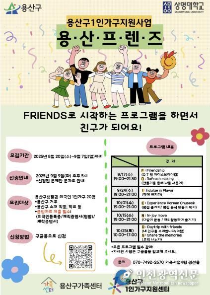 [인천광역신문] 최훈 기자 | 서울 용산구가 내달 중 지역 내 거주하는 외국인 1인가구의 안정적인 정착과 사회적 고립 예방을 위한 ‘용산 프렌즈(Friends)’ 프로그램을 운영한다. 참가자 정원은 20명이며 내달 7일까지 모집한다.