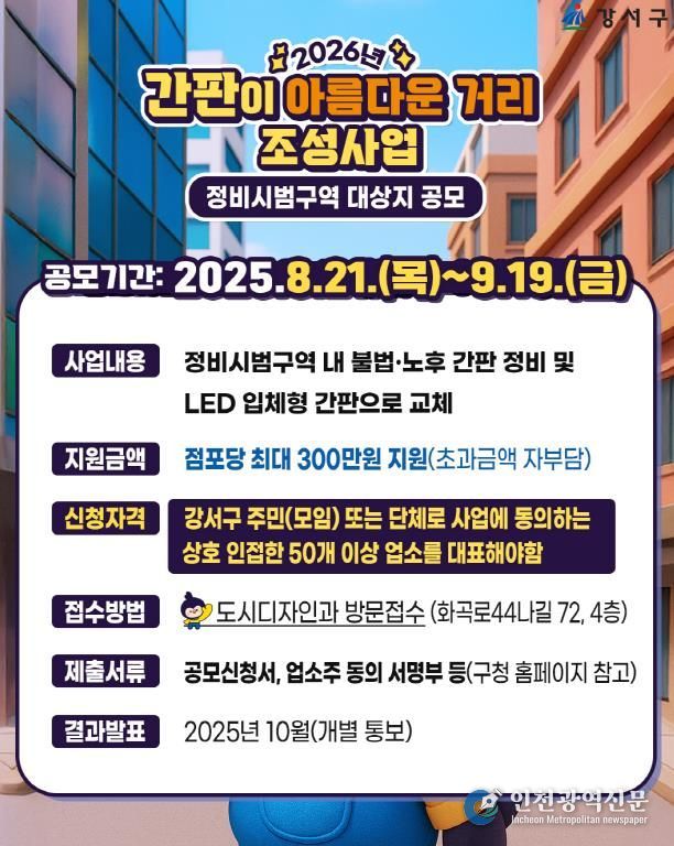 [인천광역신문] 최훈 기자 | 서울 강서구는 간판이 아름다운 거리 조성을 위해 오는 19일까지 '2026년 간판개선사업' 참여 대상지를 공모한다고 밝혔다.