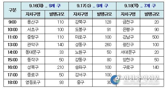 시는 원활한 상품권 구매를 위해 오는 16일부터 3일간 나누어 발행해 동시 구매자를 최대한 분산한다. 용산·서초구 등을 시작으로 9개 자치구 상품권은 오는 16일에, 강북·도봉구 등 9개 자치구 상품권은 17일에, 금천·은평구 등 7개 자치구 상품권은 18일에 구매할 수 있다.