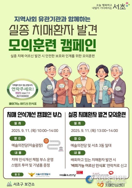 [인천광역신문] 최훈 기자 | 서울 서초구는 오는 11일, 예술의전당과 서초3동 치매안심마을 일대에서 ‘실종 치매환자 신속 발견 모의훈련’을 실시한다고 밝혔다. 이번 모의훈련은 올해 2회째를 맞아 서초3동 치매안심경로당을 거점으로 지역 밀착형 대응 체계를 더욱 강화할 전망이다.