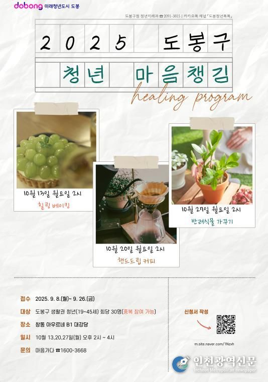 [인천광역신문] 최훈 기자 | 서울 도봉구가 도봉구 생활권(거주·재직·재학) 19~45세 청년의 정서적 안정을 위해 ‘2025년 청년 마음챙김 프로그램’을 운영한다.