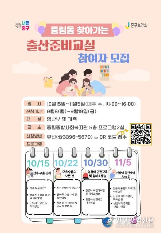 [인천광역신문] 최훈 기자 | 서울 중구가 10월 15일부터 11월 5일까지 매주 수요일 오후 2시 중림동에서 '찾아가는 출산준비교실'을 운영한다.