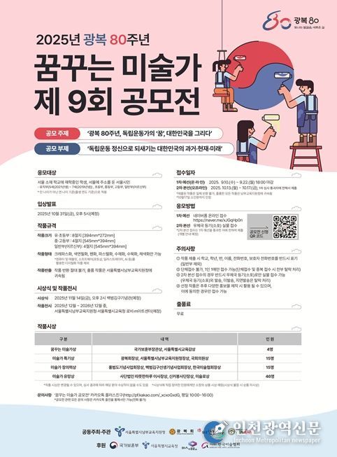 [인천광역신문] 최훈 기자 | 서울시교육청 산하 남부교육지원청과 광복회‧(사)따뜻한하루‧신커봉사단과 공동주최ˑ주관하고, 국가보훈부ˑ서울특별시교육청ˑ(사)한국미술협회ˑ미술로(주)가 후원하는 제9회 꿈꾸는 미술가 공모전’ 이 9월부터 10월까지 진행된다.