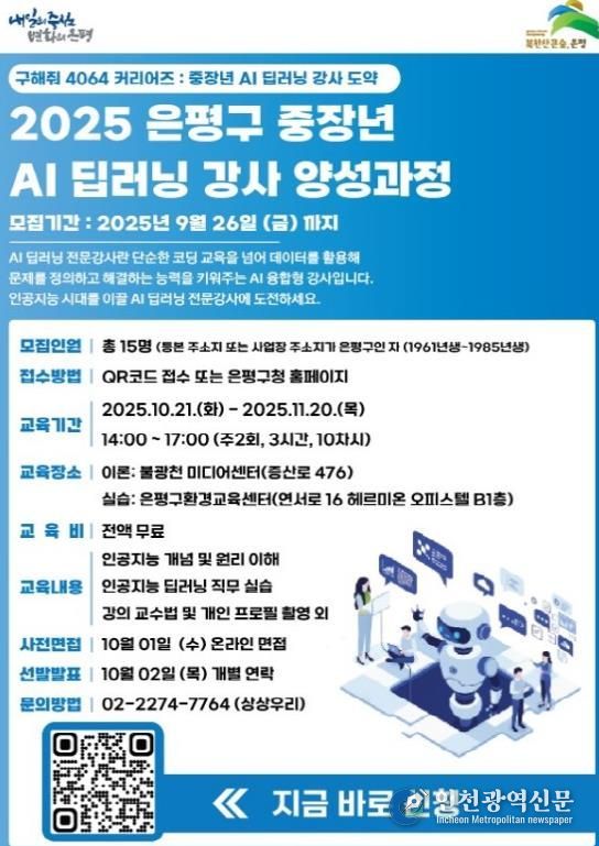 [인천광역신문] 최훈 기자 | 서울 은평구는 중장년층의 경력전환과 창직(創職)을 지원하기 위해 ‘구해줘 4064 커리어즈 시즌2: AI 인공지능(딥러닝) 교육 전문가 양성과정’ 참여자를 모집한다고 밝혔다.
