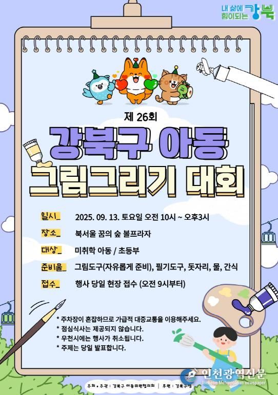 [인천광역신문] 최훈 기자 | 서울 강북구는 오는 9월 13일 오전 10시부터 오후 3시까지 북서울꿈의숲 볼프라자에서 ‘제26회 아동 그림 그리기 대회’를 개최한다.
