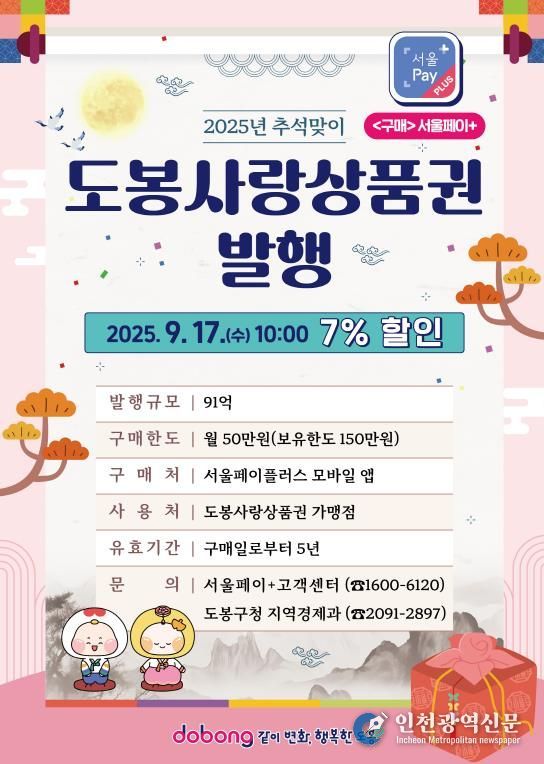 [인천광역신문] 최훈 기자 | 서울 도봉구가 오는 9월 17일 오전 10시 총 91억 원 규모의 ‘도봉사랑상품권’을 발행한다.
