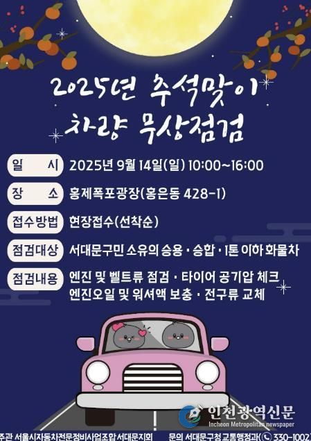 [인천광역신문] 최훈 기자 | 서대문구가 명절을 맞는 구민들의 안전한 차량 이용을 위해 ‘서울시 자동차전문정비사업조합 서대문지회’와 함께 ‘2025년 추석맞이 차량 무상점검’을 실시한다.