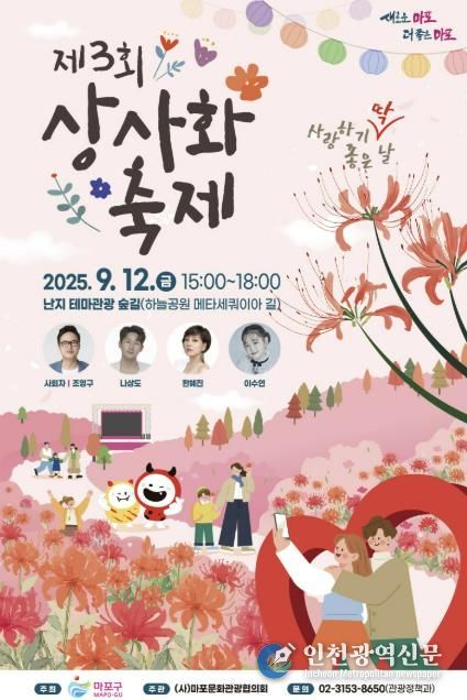 [인천광역신문] 최훈 기자 | 마포구는 9월 12일 난지 테마관광 숲길에서 ‘사랑하기 딱 좋은 날’이라는 주제로 (사)마포문화관광협의회 주관 ‘제3회 마포구 상사화 축제’를 개최한다.
