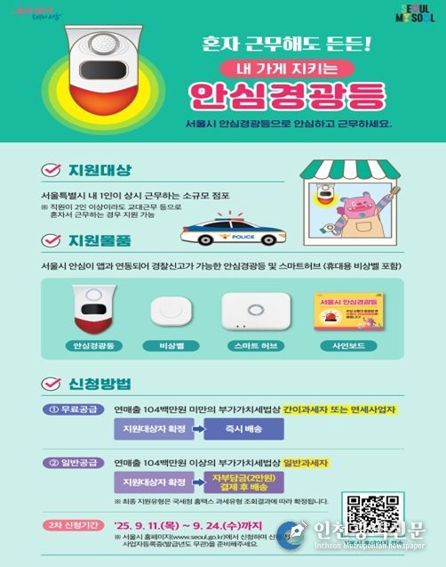 서울시가 이렇게 혼자 일하면서 불안한 상황에 놓이기 쉬운 ‘나홀로 사장님’의 안전을 지키기 위해 ‘내 가게 지키는 안심경광등’ 추가 신청을 받는다. 앞서 5월 1차 신청에 이은 2차 신청으로, 11일 오전 10시부터 9월 24일 18시까지 서울시 누리집에서 신청하면 된다.