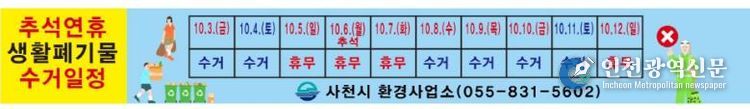 [인천광역신문] 관리자 기자 | 사천시는 추석 명절을 맞아 9월 8일부터 10월 12일까지 ‘2025년 추석 폐기물 관리대책’을 수립·추진해 명절 쓰레기 대란을 사전에 막는다고 10일 밝혔다.