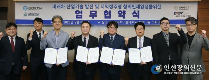 [인천광역신문] 관리자 기자 | 경상국립대학교 미래차 라이즈(RISE)사업(책임교수 김해지 미래자동차공학과 수)는 9월 9일 동원과학기술대학교에서 경상국립대학교, 경남대학교, 인제대학교, 동원과학기술대학교와 함께 ‘미래차 산업기술 발전 및 지역정주형 창의인재 양성을 위한 업무협약’을 체결했다.