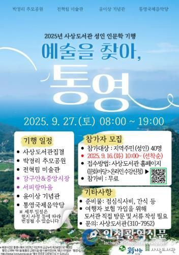 [인천광역신문] 관리자 기자 | 부산 사상구는 사상도서관에서 오는 9월 27일 통영으로 떠나는 성인 인문학 기행을 운영한다고 밝혔다.