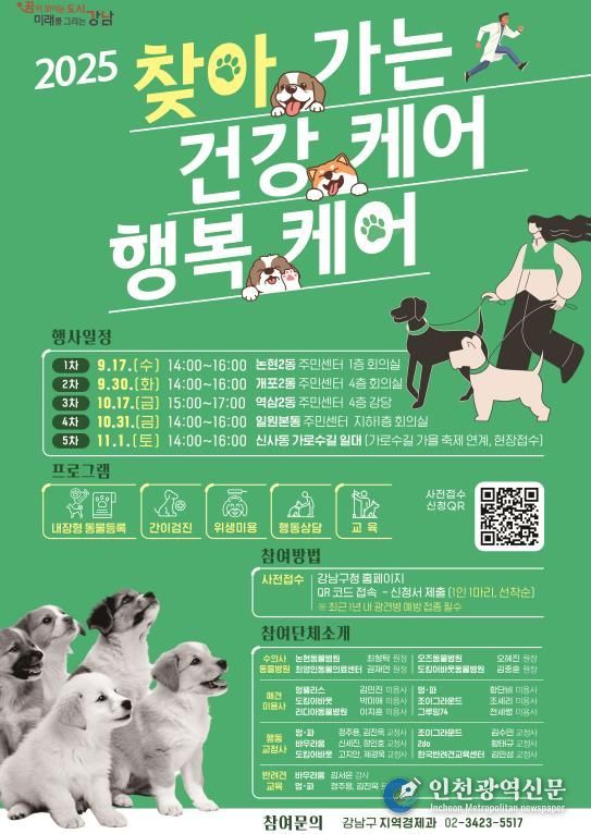 [인천광역신문] 최훈 기자 | 꿈이 모이는 도시, 미래를 그리는 강남구가 반려동물과 사람이 함께 사는 건강한 도시를 만들기 위해, 9월부터 11월까지 ‘찾아가는 건강케어 행복케어’ 반려견 복지 서비스를 운영한다.