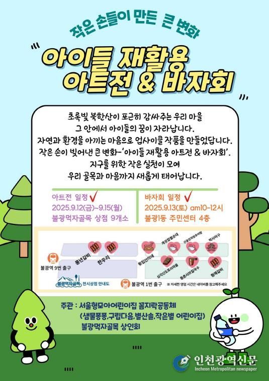 [인천광역신문] 최훈 기자 | 서울 은평구는 불광먹자골목 골목형상점가에서 오는 12일부터 15일까지 ‘아이들 재활용 아트전 · 바자회’를 개최한다고 밝혔다.