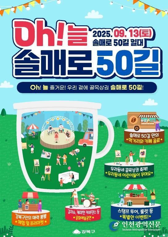 [인천광역신문] 최훈 기자 | 서울 강북구는 오는 13일 오전 11시부터 오후 6시까지 미아역 인근 솔매로50길 상권에서 ‘오(Oh)!늘, 솔매로50길 축제’를 개최한다고 밝혔다.