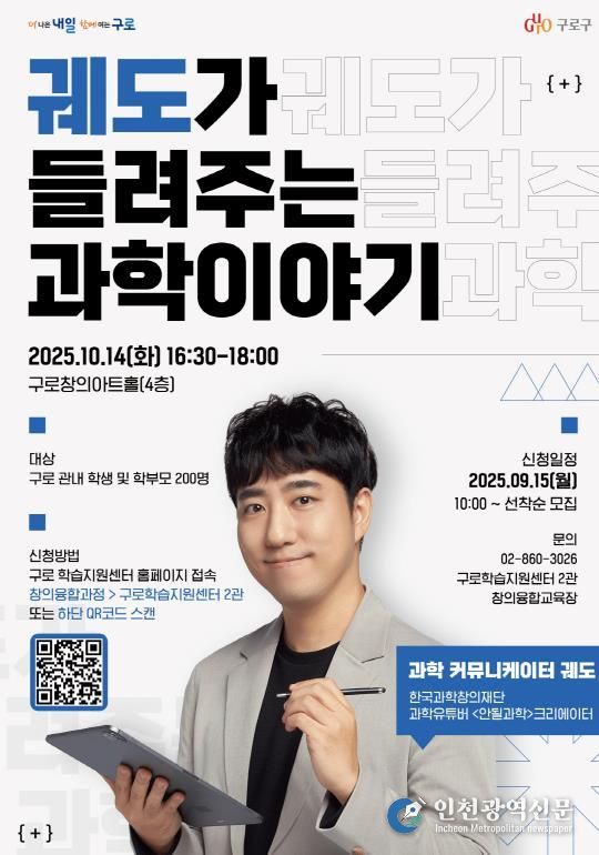 ‘궤도가 들려주는 과학 소통 강연회’는 10월 14일 오후 4시 30분 구로창의아트홀에서 열리며, ‘이세돌 사범이 전하는 미래의 힘 체험 및 강연회’는 11월 4일 오후 4시에 진행된다.