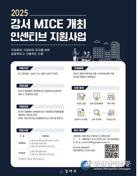 [인천광역신문] 최훈 기자 | 서울 강서구가 국제회의나 기업회의를 개최하는 기관과 단체를 지원하는 ‘2025 강서 마이스(MICE) 개최 인센티브 지원사업’을 본격 추진한다.