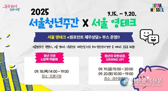 한편, 서울시는 청년주간(9.15~9.20)을 맞아 청년 현장으로 찾아가는 ‘영테크 재무상담’을 3회 개최한다고 밝혔다. 9월 18일(목)에는 도봉구청에서 열리는 ‘청년 진로&정책 박람회’에서, 9월 19일부터 20일 양일간은 성수일로33에서 개최되는 2025 서울청년주간 '청년의 무한 성장, 그라운드 업(GRWND UP)!'에서 진행된다.