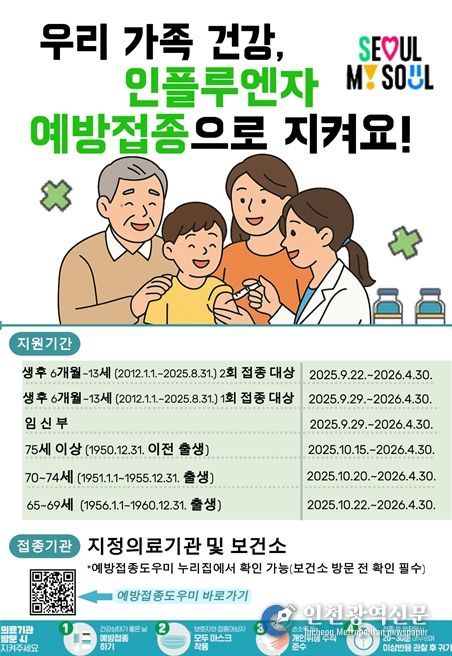 [인천광역신문] 최훈 기자 | 서울시는 다가오는 겨울철 인플루엔자 유행에 대비해 시민 건강 보호에 나선다. 시는 오는 22일부터 내년 4월 30일까지 ▴어린이 ▴임신부 ▴65세 이상 어르신을 대상으로 연령대별 순차 무료 예방접종을 시행한다. 접종은 대상·연령별로 시기를 분산해 쏠림을 방지하고, 보다 안전한 접종을 유도할 계획이다.
