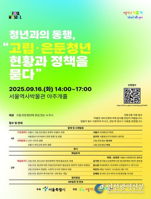 [인천광역신문] 최훈 기자 | 서울시는 오는 9월 16일 오후 2시, 서울역사박물관 야주개홀에서 '청년과의 동행, 고립·은둔청년 현황과 정책을 묻다'를 주제로 고립·은둔 청년 정책 포럼을 개최한다고 밝혔다.