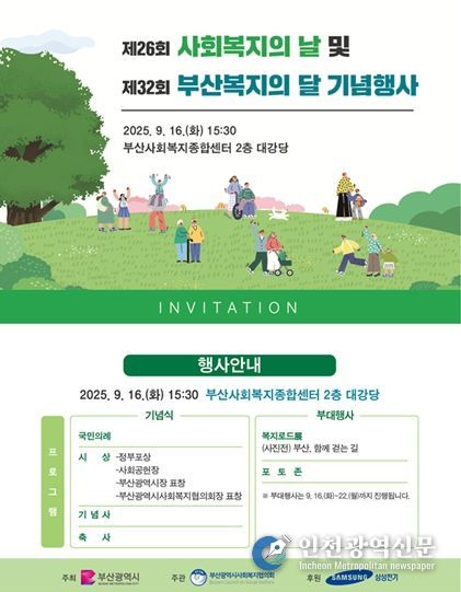 [인천광역신문] 관리자 기자 | 부산시는 16일 오후 3시 30분 부산사회복지종합센터 대강당에서 '제26회 사회복지의 날'과 '제32회 부산복지의 달'을 맞아 기념행사를 개최한다고 밝혔다.