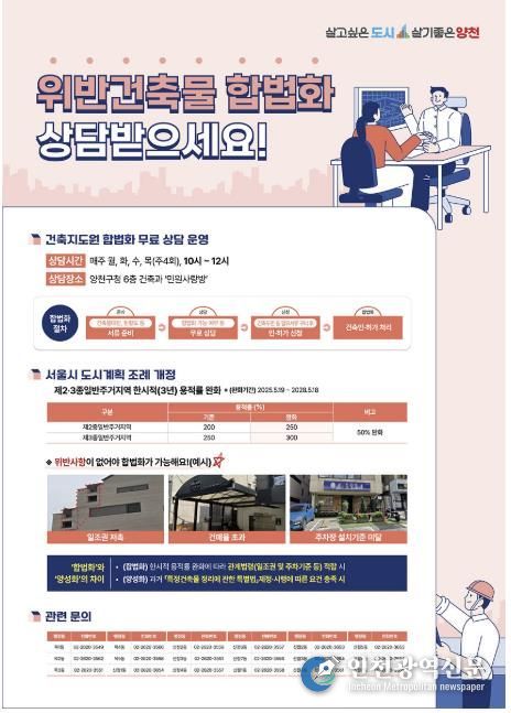 [인천광역신문] 최훈 기자 | 양천구는 서울시 도시계획조례 개정으로 제2·3종 일반주거지역 용적률이 한시적으로 완화됨에 따라, 건축사가 참여하는 전문 상담센터를 운영해 위반건축물 합법화 절차를 지원한다고 16일 밝혔다.