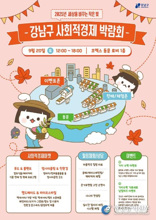 [인천광역신문] 최훈 기자 | 꿈이 모이는 도시, 미래를 그리는 강남구가 오는 9월 20일 낮 12시부터 오후 6시까지 코엑스 동문 로비 1층에서 ‘2025 강남구 사회적경제박람회’를 개최한다. 올해 행사는 기존 강남역 야외무대에서 벗어나 실내 공간에서 열리며, 사회적경제기업 30여 개소가 참여한다.