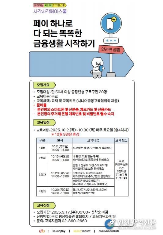 [인천광역신문] 최훈 기자 | 구로구가 오는 10월 구로평생학습관(구로구청 신관 2층)에서 중장년층 주민의 디지털 금융 역량 강화를 위한 ‘찾아가는 시니어 디지털스쿨’을 운영한다.