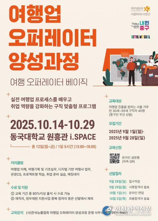 [인천광역신문] 최훈 기자 | 서울 중구가 관광산업 전문 인재를 양성으로 지역 관광업 구인난을 해소하기 위해 동국대 서울RISE사업단과 공동으로 10월 14일부터 10월 29일까지 '여행업 오퍼레이터 양성과정'을 운영한다.