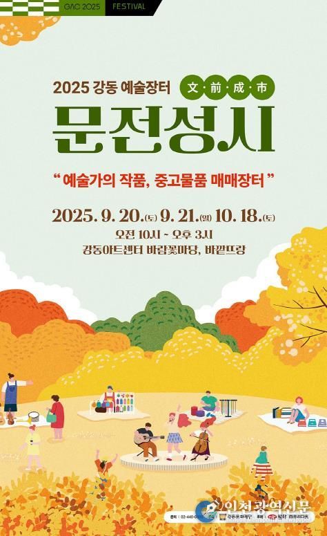 [인천광역신문] 최훈 기자 | 강동문화재단은 9월 20일과 21일, 강동예술장터 '문전성시(文前成市)'를 강동아트센터 앞 광장(바람꽃마당)과 옥상 정원(바깥뜨랑)에서 개최한다고 밝혔다. 60여 명의 지역 예술인이 참여해 작품 판매는 물론, 정원음악회·정원사진관·책 읽는 마당 등 다채로운 프로그램이 어우러지는 문화예술 축제로 펼쳐진다.