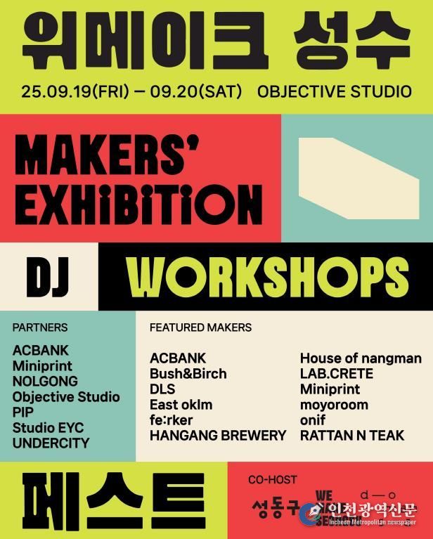 [인천광역신문] 최훈 기자 | 서울 성동구는 성수동 제작 문화를 기반으로 한 로컬 메이커 축제 ‘WE MAKE FEST 2025(위메이크페스트)’를 오는 9월 19일부터 20일까지 북성수 오브젝티브 스튜디오에서 개최한다고 밝혔다.
