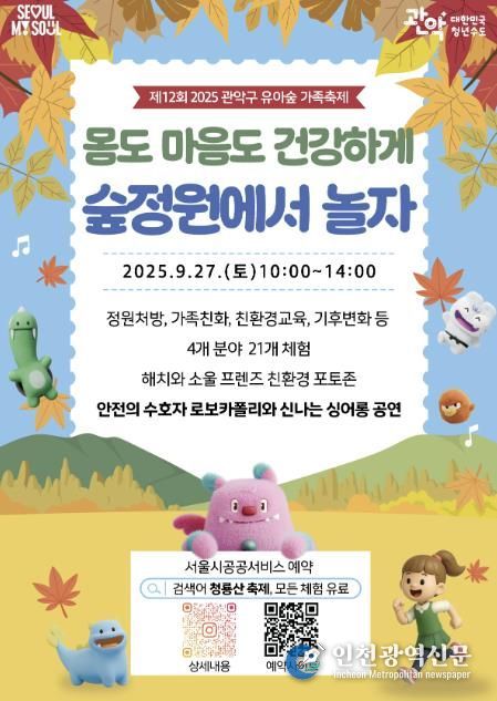 [인천광역신문] 최훈 기자 | 관악구가 오는 27일 오전 10시부터 오후 2시까지 청룡산 유아숲체험원에서 ‘2025년 제12회 유아숲 가족 축제’를 개최한다.