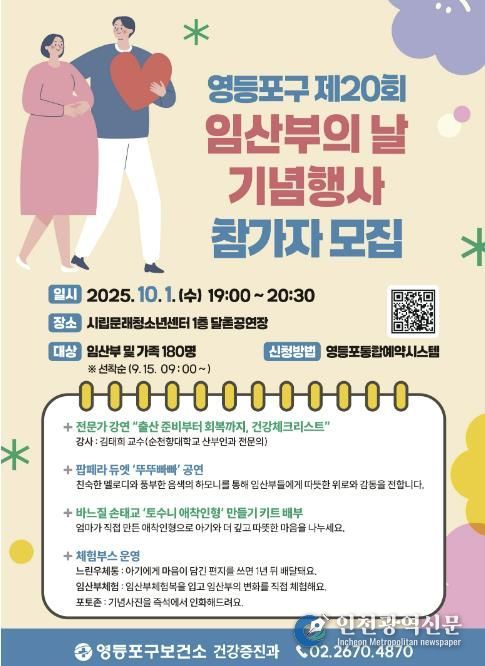 [인천광역신문] 최훈 기자 | 영등포구가 오는 10월 1일 오후 7시, 시립문래청소년센터 달촌공연장에서 ‘제20회 임산부의 날 기념행사’를 연다고 밝혔다. 행사는 임신과 출산의 소중함을 되새기고, 임산부와 가족이 함께 힐링할 수 있는 특별한 자리로 마련했다.
