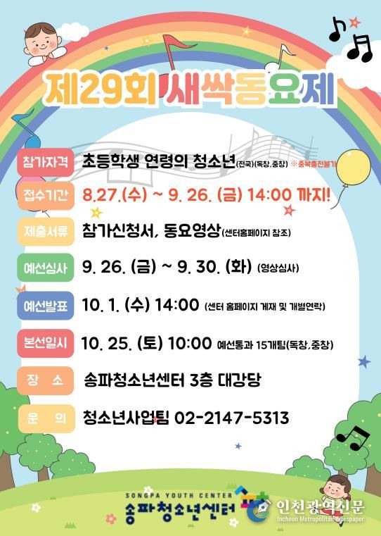 [인천광역신문] 최훈 기자 | 서울 송파구가 가을날 청소년들의 감수성을 채워줄 아동·청소년 음악축제를 10월 25일 송파청소년센터 대강당에서 개최하고, 참가팀을 모집한다고 알렸다.
