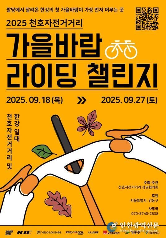 [인천광역신문] 최훈 기자 | 서울 강동구는 오는 9월 18일부터 27일까지 10일간, 천호자전거거리와 한강 일대에서 ‘2025 천호자전거거리 가을바람 라이딩 챌린지’를 개최한다고 17일 밝혔다.