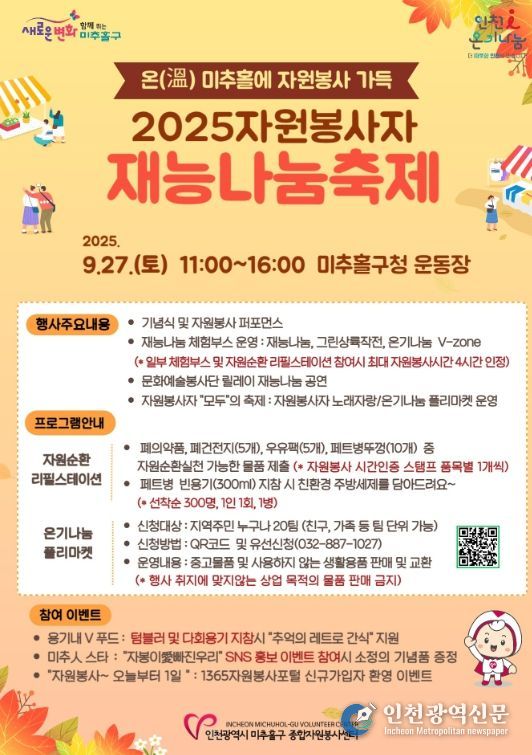 [인천광역신문] 최예준 기자 | 인천 미추홀구종합자원봉사센터는 오는 27일 미추홀구청 운동장에서 ‘온(溫) 미추홀에 자원봉사 가득 - 2025 자원봉사자 재능 나눔 축제’를 개최한다.