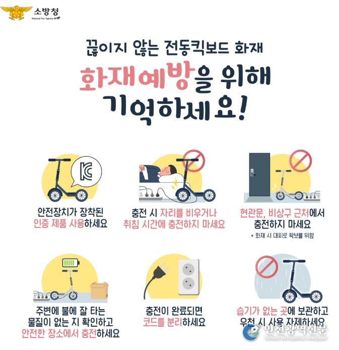 [인천광역신문] 최예준 기자 | 계양소방서는 전동킥보드 등 개인형 이동장치의 배터리 충전 과정에서 발생할 수 있는 화재를 예방하기 위해 집중 홍보에 나섰다고 19일 밝혔다.