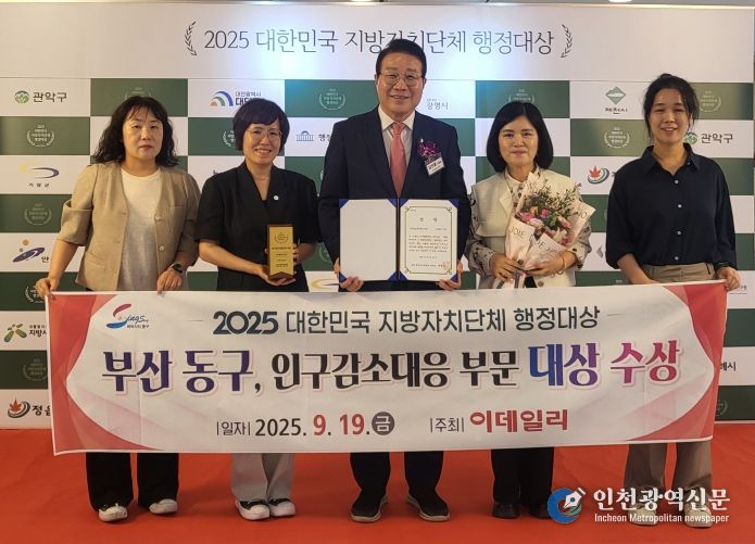 [인천광역신문] 관리자 기자 | 부산 동구가 9월 19일 서울 중구 KG타워 하모니홀에서 열린『2025 대한민국 지방자치단체 행정대상』시상식에서 인구감소대응부문 대상을 수상했다고 밝혔다.