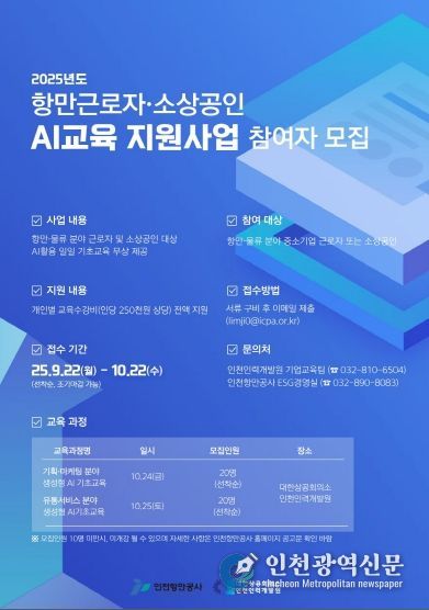 인천항만공사 신재완 환경·사회·투명 경영실장(ESG경영실장)은 “AI 시대 중소기업 근로자과 소상공인의 자기계발 지원과 AI 활용 확산을 위해 본 교육사업을 마련했다”라며, “앞으로도 인천항 협력기업과 지역사회 중소기업과의 상생경영 실천을 위해 다양한 지원사업을 적극 추진하겠다”고 말했다.