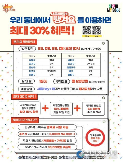 ' 29일(월)부터 ‘자치구 배달전용상품권’ 110억 규모 발행… ‘서울페이+’ 앱에서 15% 할인 판매'