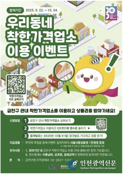 [인천광역신문] 최훈 기자 | 금천구는 착한가격업소 이용 촉진을 위해 22일부터 10월 24일까지 ‘착한가격업소 이용 이벤트’를 진행한다고 밝혔다.