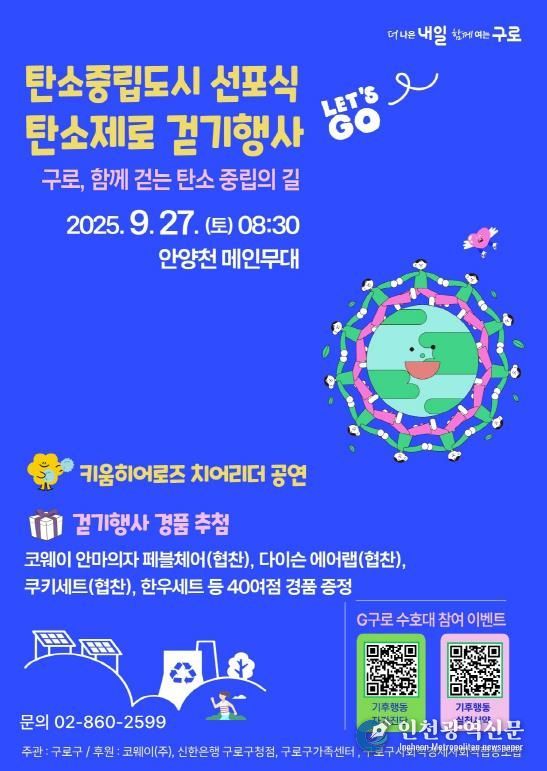 [인천광역신문] 최훈 기자 | 구로구가 오는 27일 오전 8시 30분 안양천 구로G페스티벌 메인무대에서 ‘구로, 함께 걷는 탄소중립의 길’을 주제로 ‘탄소중립도시 구로’ 선포식을 개최한다.